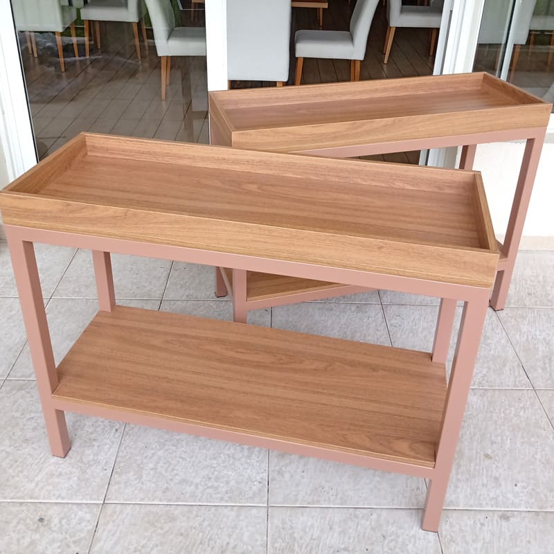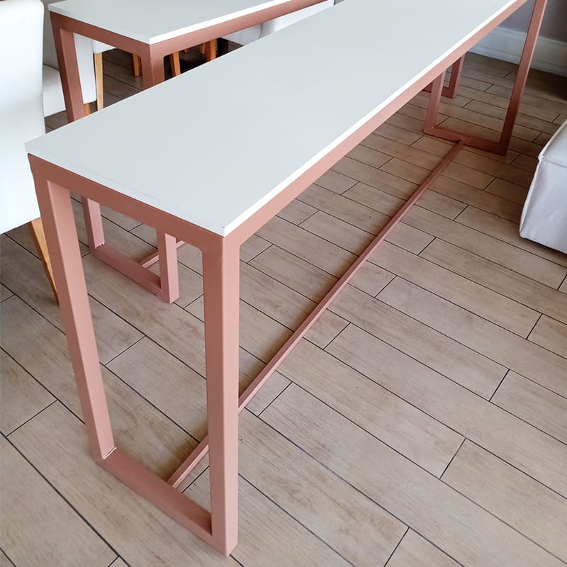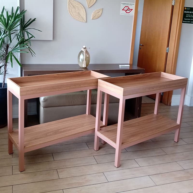 Destacamos o uso de tampos em MDF, escolhidos para facilitar a manutenção e o uso diário dessas peças. Além disso, a estrutura de ferro recebeu uma pintura sofisticada na elegante cor cobre, conferindo um toque de distinção ao ambiente.