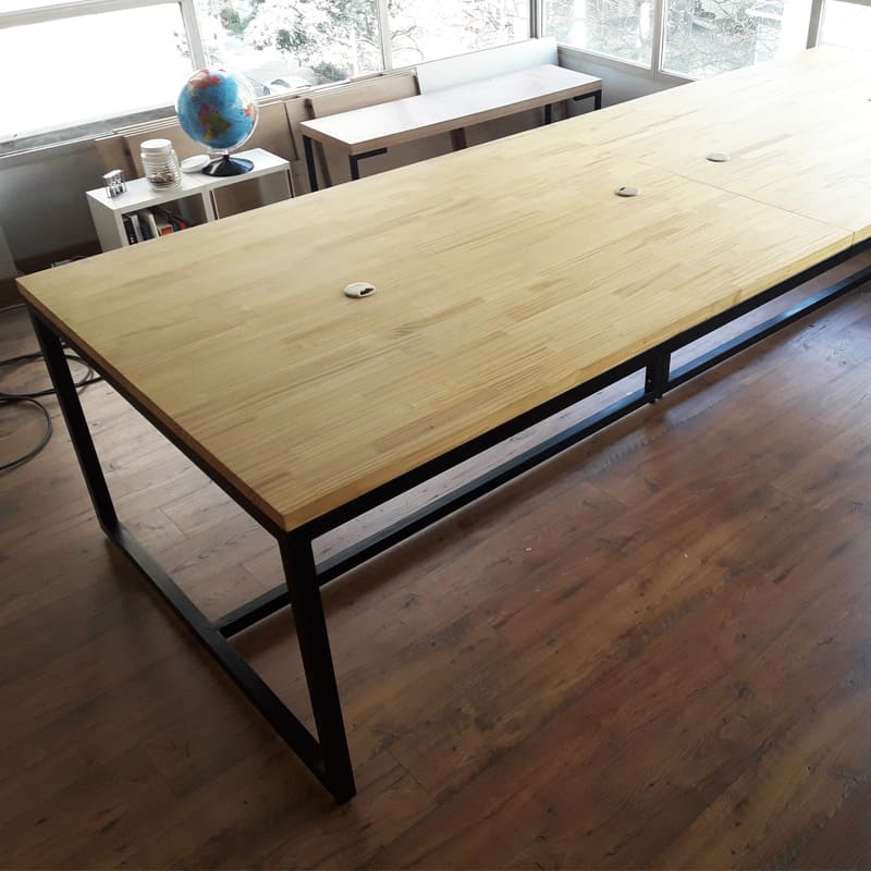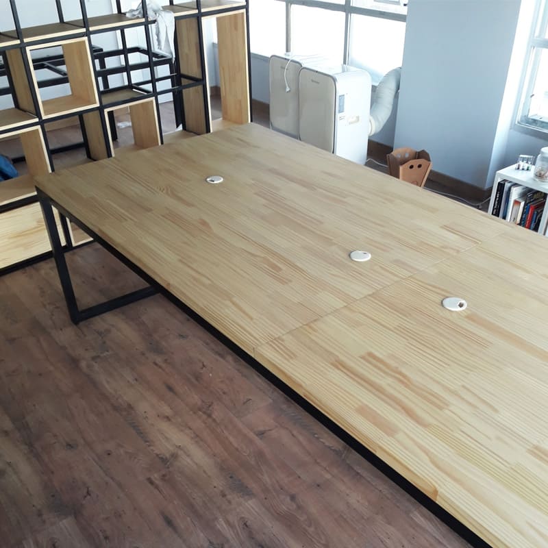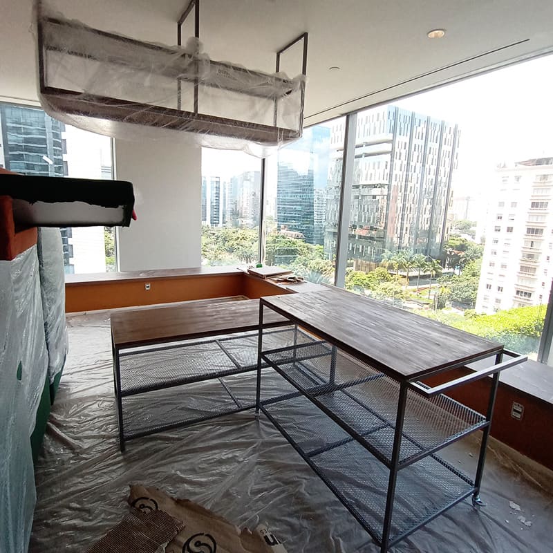 Além disso, entregamos duas mesas igualmente grandiosas, medindo 4 e 5 metros de comprimento. Suas robustas estruturas de ferro foram transportadas desmontadas e montadas pela nossa equipe no local. Um detalhe dessas mesas são os amplos vãos sob os tampos, criando um ambiente mais acolhedor e confortável para os clientes do espaço.