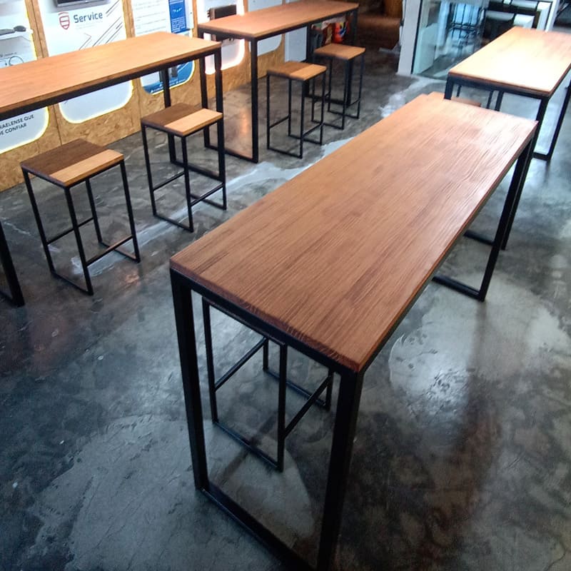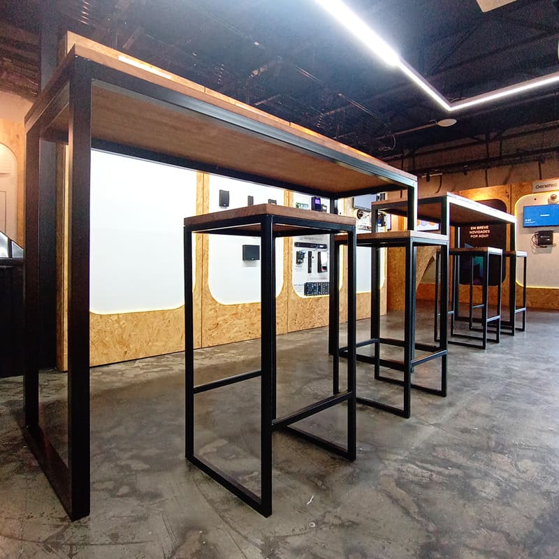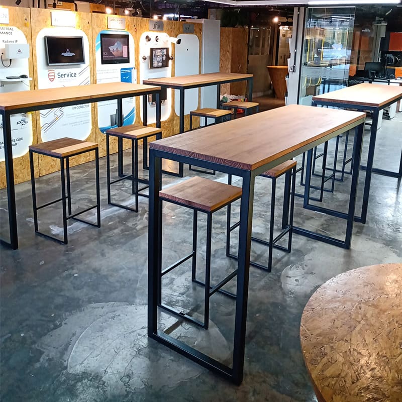 Neste projeto, optamos por tampos de madeira mais robustos para as mesas, garantindo durabilidade e uma estética sólida. E as banquetas foram desenvolvidas de acordo com as especificações do nosso cliente, que contribuiu com o design do modelo e nos enviou suas ideias.