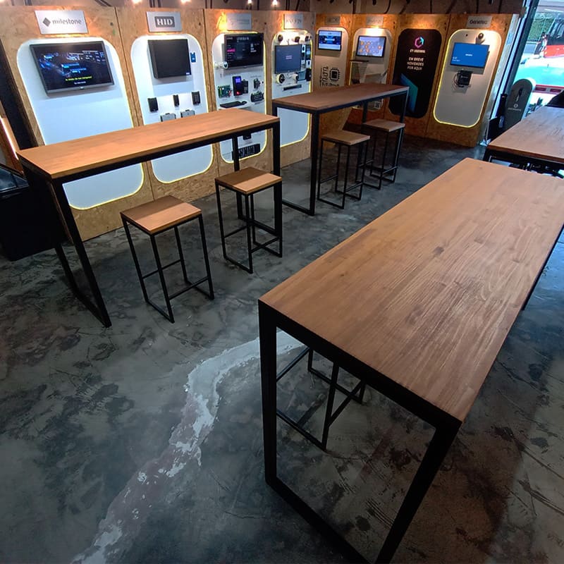 Para atender às necessidades desta empresa de segurança em Pinheiros, São Paulo, fornecemos conjuntos de mesas e banquetas bistrô que foram estrategicamente colocados na sala de entrada do espaço. A finalidade principal era proporcionar um local acolhedor para receber clientes e realizar reuniões e eventos.