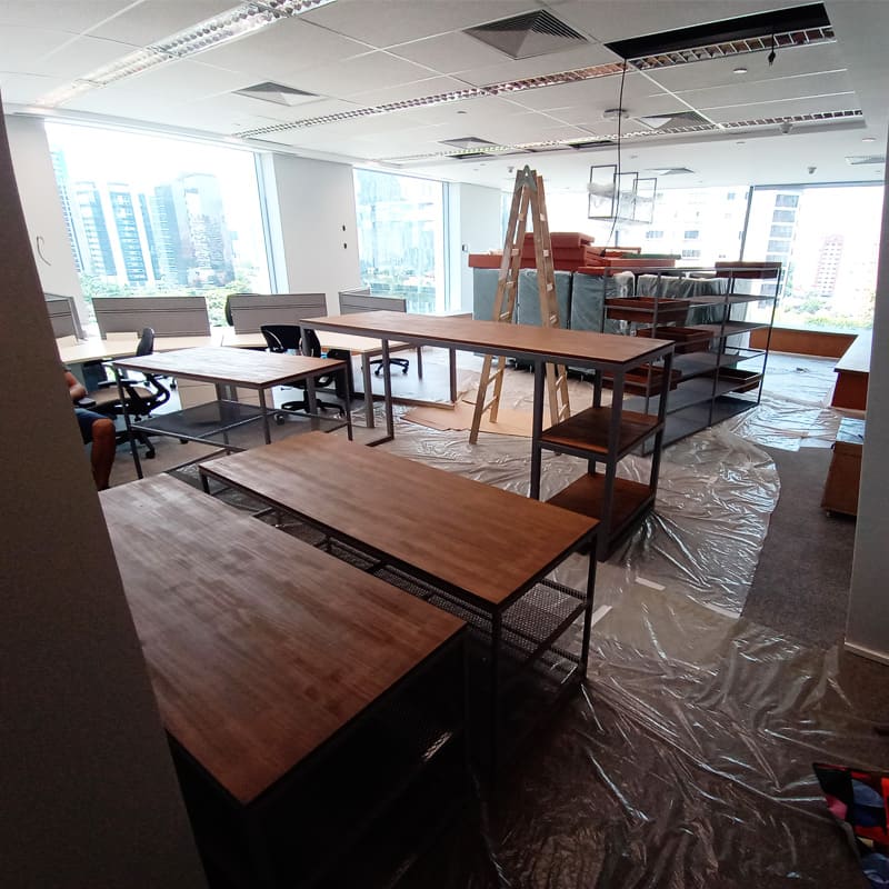 Uma característica distintiva dessas peças é a escolha da pintura em cinza texturizado para toda a estrutura de ferro, conferindo um toque de sofisticação que se destaca da tradicional tonalidade preta. Este projeto resultou em um ambiente de trabalho que não apenas é funcional, mas também transmite um senso de elegância contemporânea.